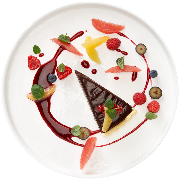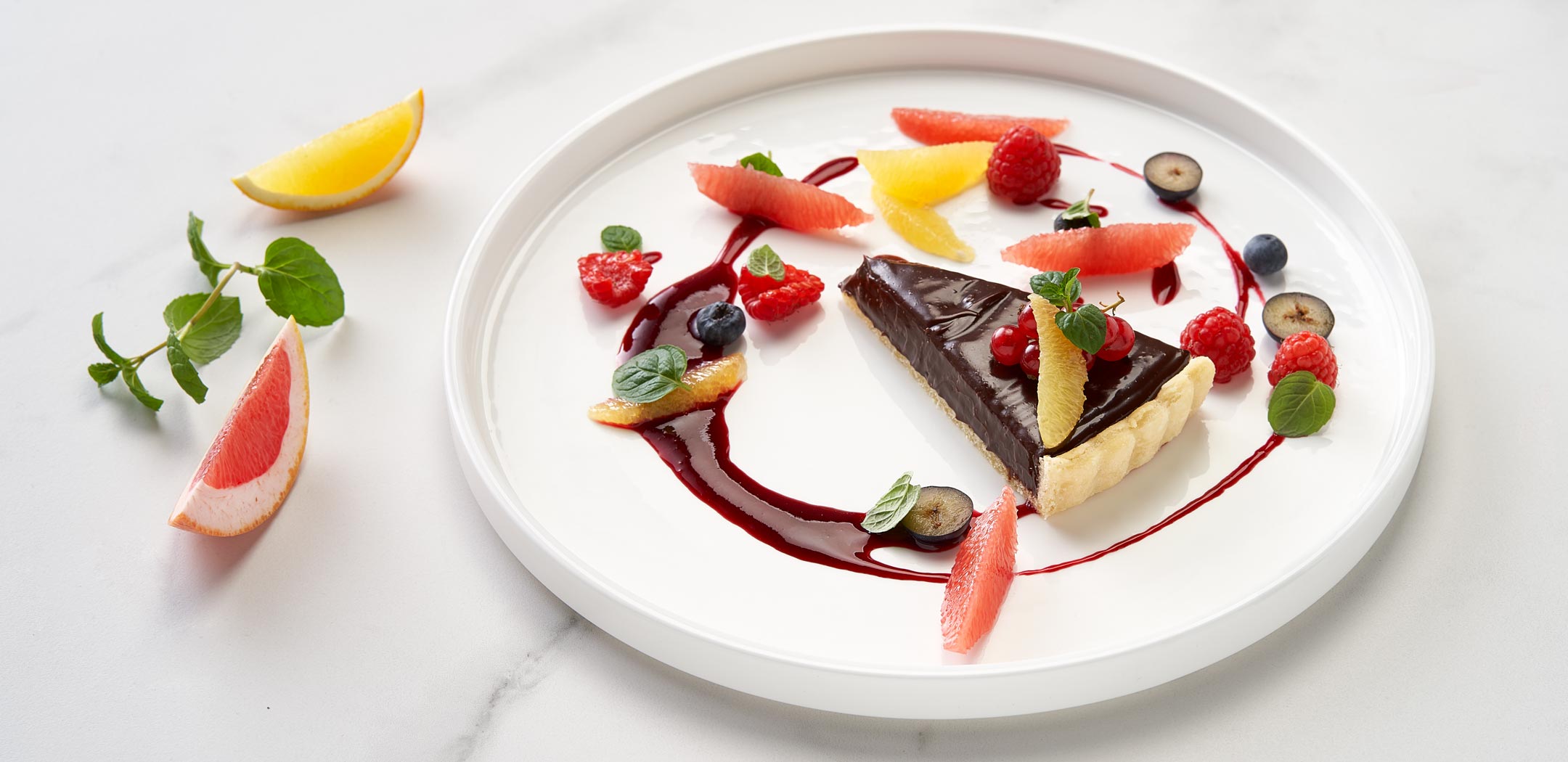 Die Coulis auf den Teller geben, ein Stück der Tarte dazugeben und alles mit Beeren und Zitrusscheiben dekorieren. Mit Pfefferminzblättern garnieren.